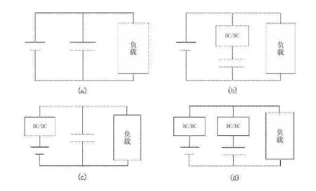 與超級電容配合使用的DCDC,在整車電源中的位置如下圖所示,它可能出現(xiàn)在圖(b)、(c)、(d)中所示位置上,而(b)是應用較多的一種形式。