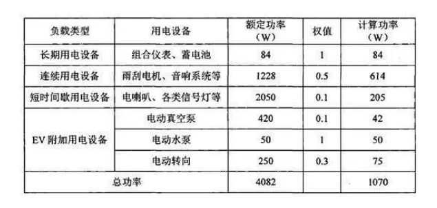 根據(jù)純電動汽車車載電子設備的不同屬性,能把用電設備分為長期用電、連續(xù)用電、短時間間歇用電和附加用電設備種類型,并賦于不同的權值。其中,長期用電設備包括組合儀表和蓄電池,權值取1;連續(xù)用電設備包括雨刮、電機、音響系統(tǒng)和儀表照明等設備,權值可取0.5;短時間間歇用電設備包括電喇機、各類信號燈、控制器等設備,權值可取0.1;附加用電設備電動真空泵、電動水泵和電動轉向,權值根據(jù)實際情況分別取0.1、1、0.3。各類設備所消耗功率分析如表所示。